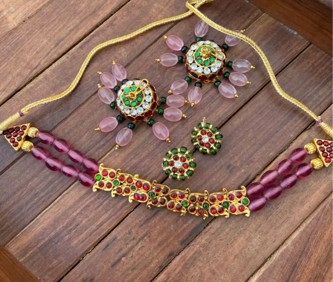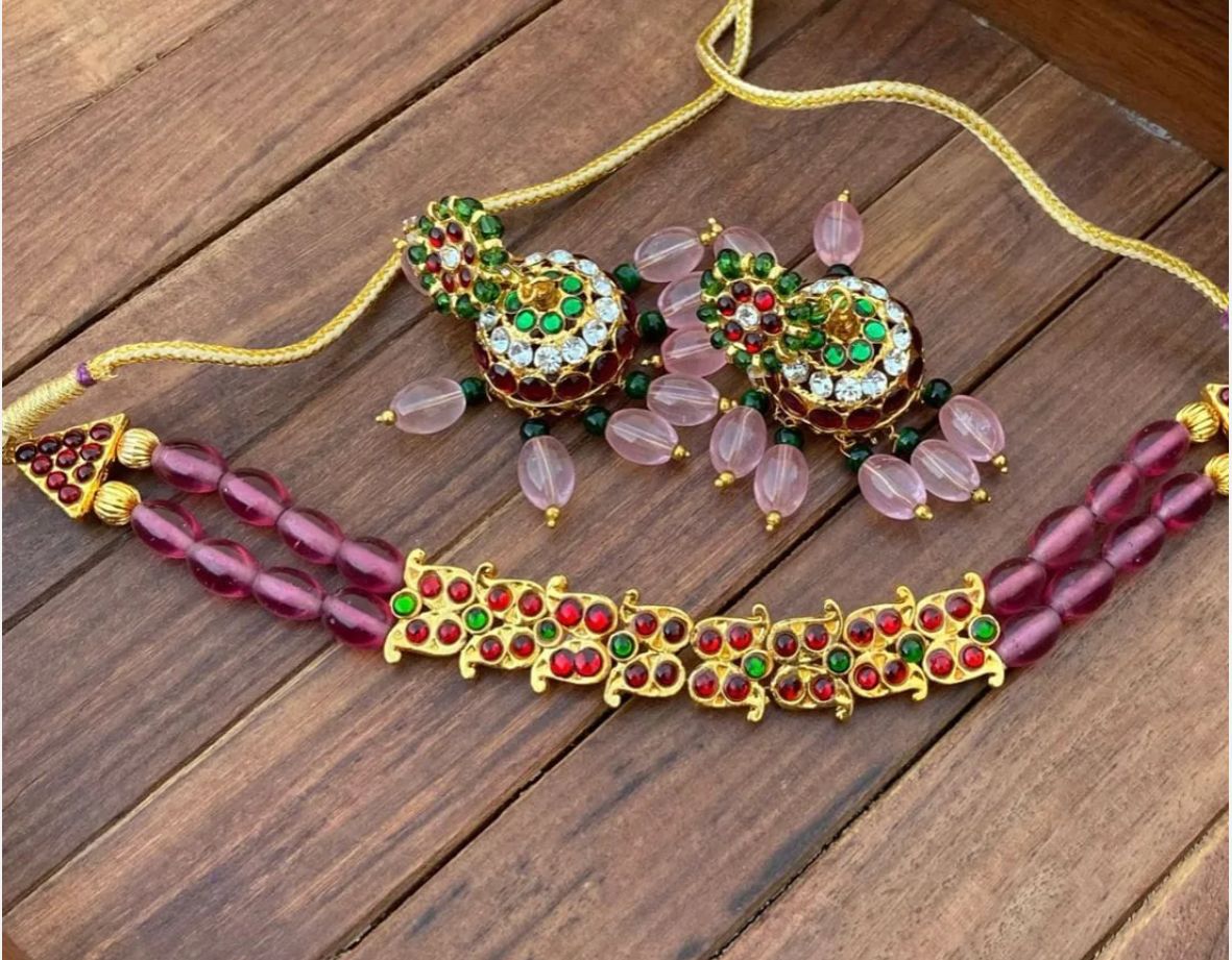 Monalisa beads pastel coloured choker with changeable earrings (stud+jhumka)