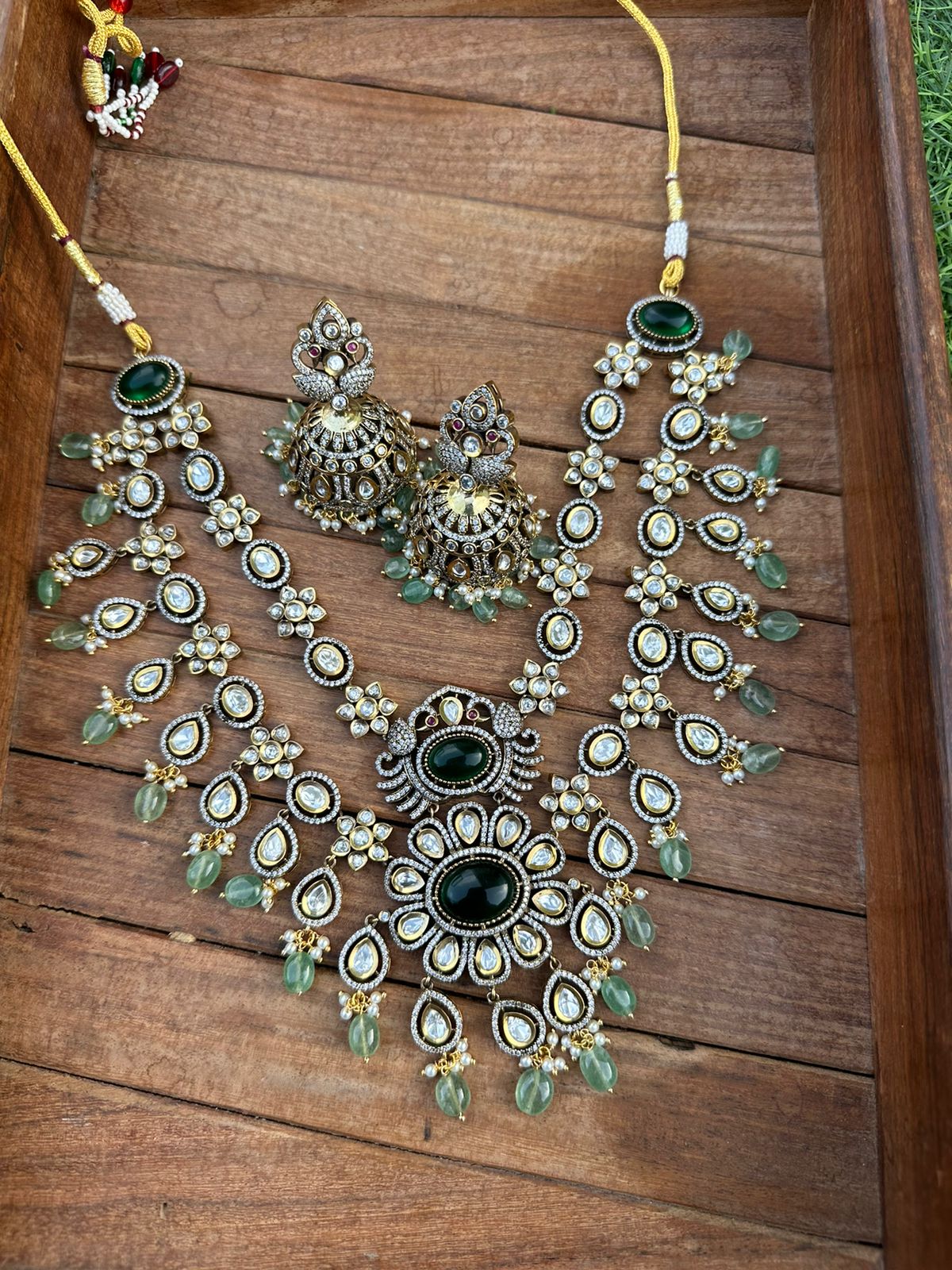 Collier victorien lourd de paon de fleur de deux couches avec jhumkas