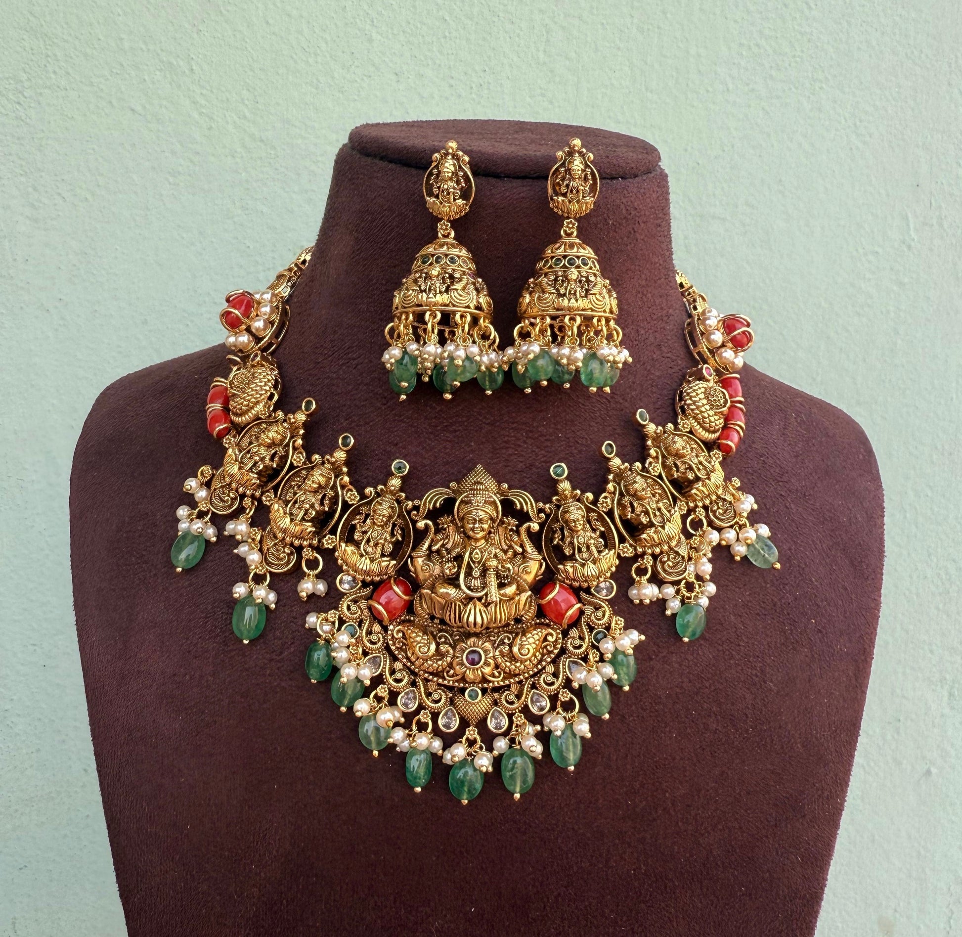 Gold look alike coral lakshmi devi necklace with jhumkas